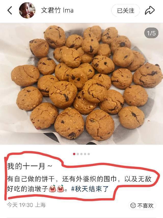近日,文君竹更新了个人社交平台,配文:有自己做的饼干,有外婆送的围巾。虽然表达的文字不多,但是充满着温情。