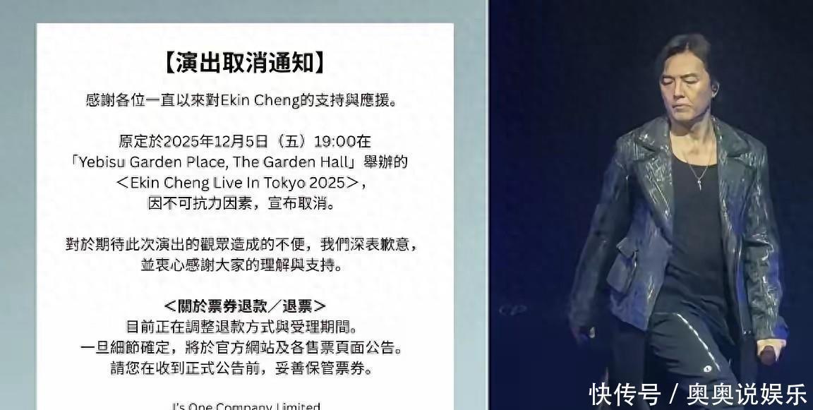 11月25日,一则突发公告炸翻娱乐圈:郑伊健原定于12月5日举办的《EKIN CHENG LIVE IN TOKYO 2025》东京演唱会,因“不可抗力因素”紧急取消。官方话术模糊不清,但背后的真相其实直白又讽刺——核心不是场馆问题,不是艺人状况,而是支撑这场演唱会的核心受众根本来不了,而本土观众又不买账。
