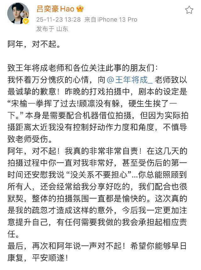 打人者吕奕豪也在23日中午发博致歉。这件事情原本没有多少网友关注,谁知道在双方回应,事件将翻篇时,相关话题迅速窜上热搜。当看到话题页面被打男演员的伤势情况时,部分网友情绪激动,心疼他遭受到了不公平对待,同情他在遭受同剧组演员霸凌后还要被道德绑架。再加上有人扒出王年将成和吕奕豪曾竞争过同一个角色,结合打人者重击王年将成眼部这种脆弱敏感的部位。