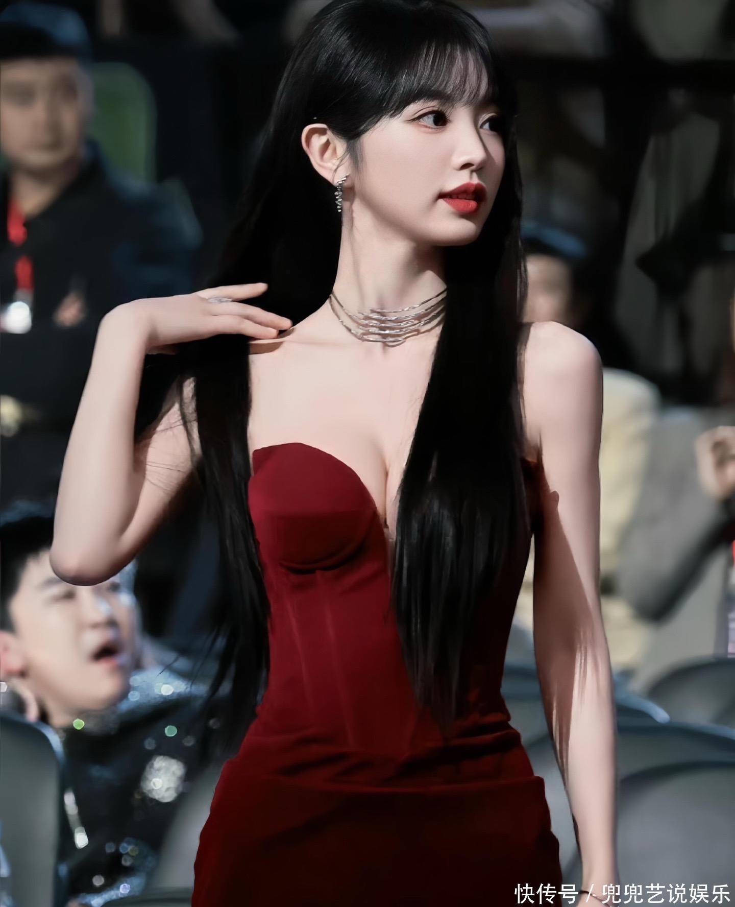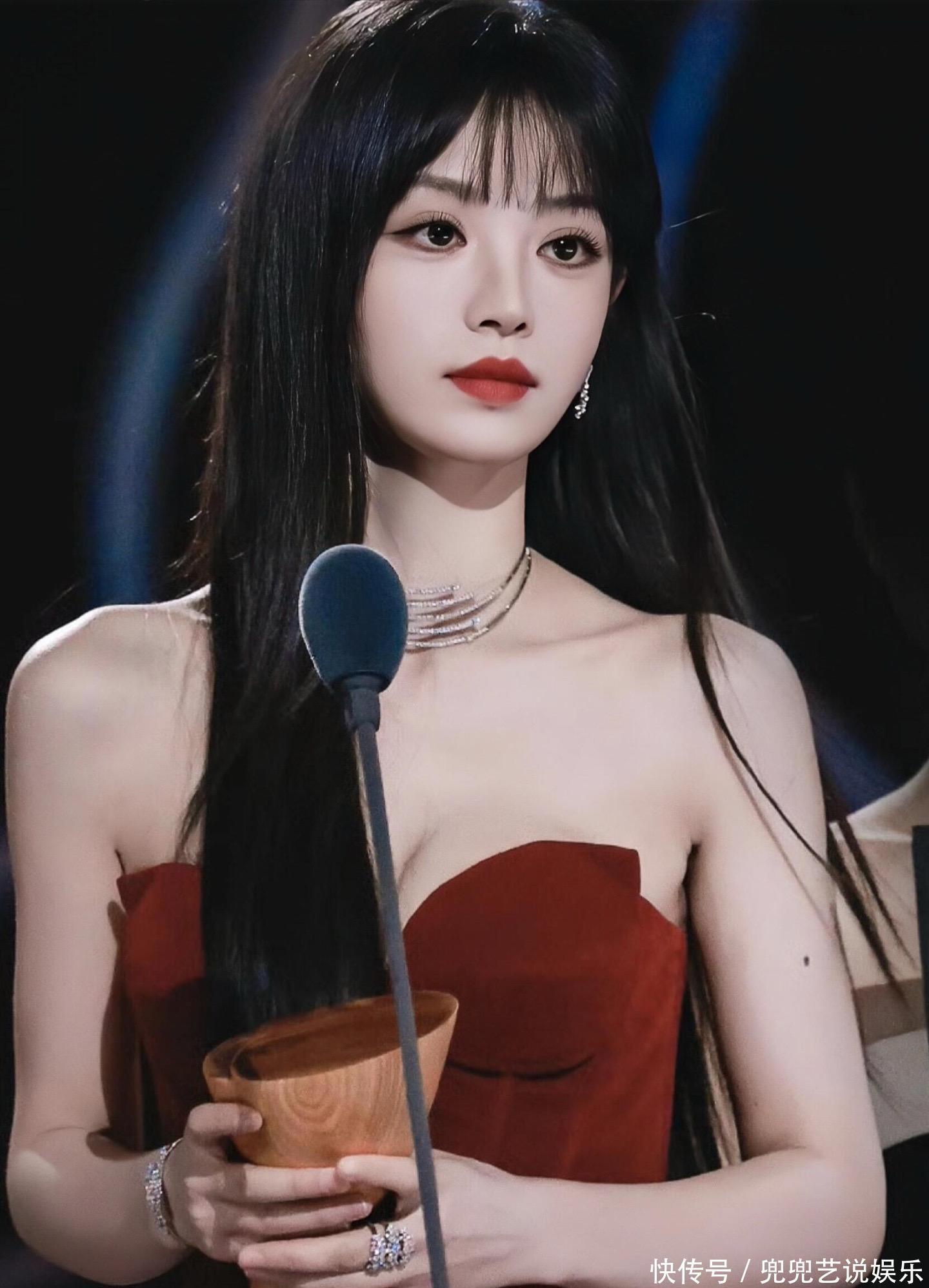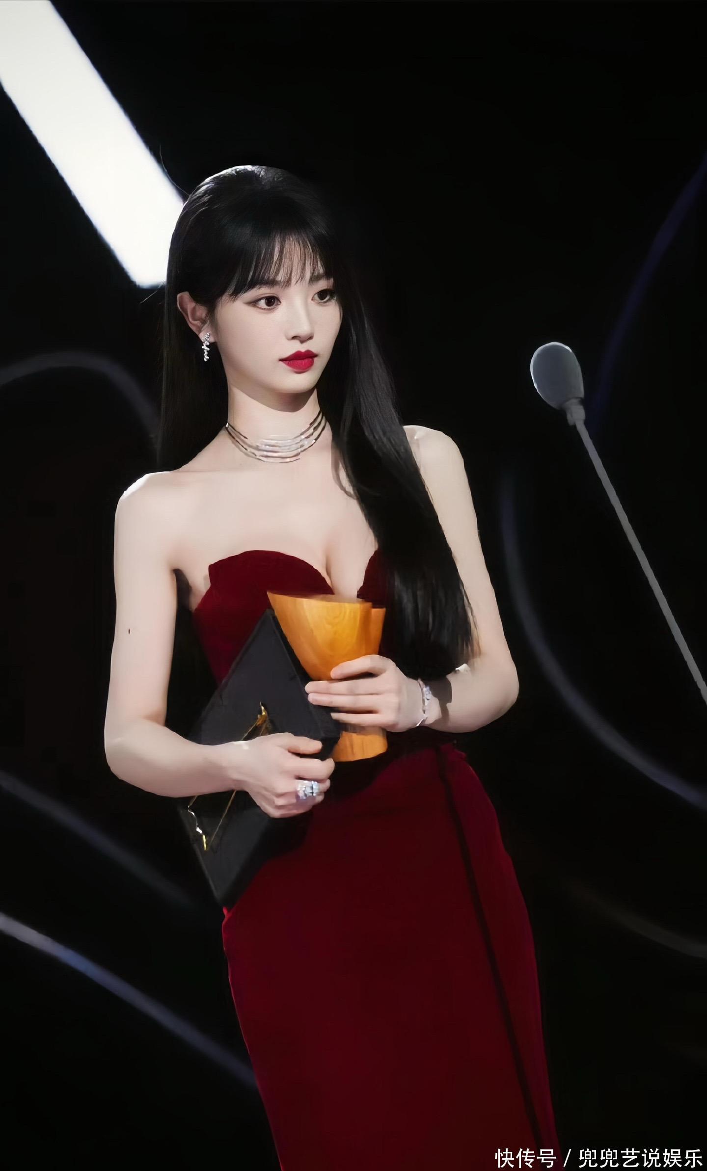 镜头里的她也太绝了!酒红色丝绒礼服裹着纤细身材,深 V 领口刚好露出精致锁骨,脖子上的小碎钻一搭,又闪又温柔。长发松松披在肩上,笑起来还是那股子软萌劲儿,眼尾弯弯的,可一抬眼,又带着点说不出的撩,捧着奖杯站在台上,甜里带点飒,完全让人移不开眼。