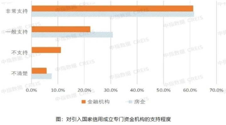 对于要不要救市,市场参与者跟管理层的观点有很大不同。在中指研究院的调查中,对于引入国家信用成立专门资金机构,加大存量房和土地的收储、向系统重要性房企注资,房企和金融机构均有超过60%的受访者表示非常支持,另外有31%的房企和22%的金融机构受访者表示一般支持,也就是说八成以上受访者支持。