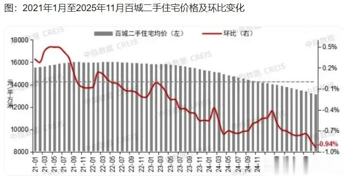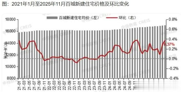 根据中指研究院发布的数据,11月份,中国百城房价指数延续新房价格上涨、二手房价格下降态势。2025年11月,中国百城新建住宅均价为每平方米17036元,环比上涨0.37%,同比上涨2.68%。当月,百城二手住宅均价为每平方米13143元,环比下跌0.94%,同比下跌7.95%。